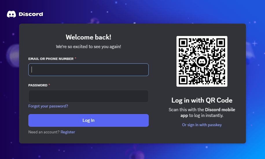 Open the Discord app on your computer or go to `discord.com/login`. You'll see the welcome screen with the login fields and, right next to them, a dynamic QR code. This is your target!